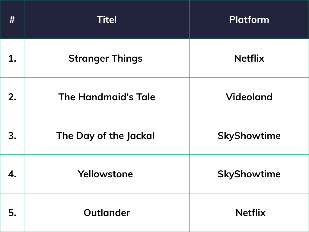 Netflix presenteerde in 2025 langverwachte nieuwe seizoenen van Stranger Things en Wednesday, enkele van de best bekeken titels op het platform. Er verschenen ook nieuwe afleveringen van de serie Outlander, die goed scoort in deze lijst. Opvallend zijn de titels van SkyShowtime in de Top 5. De dienst kwam relatief laat beschikbaar in Nederland en hoort bij de kleinere streamingdiensten, maar is verrassend goed vertegenwoordigd.