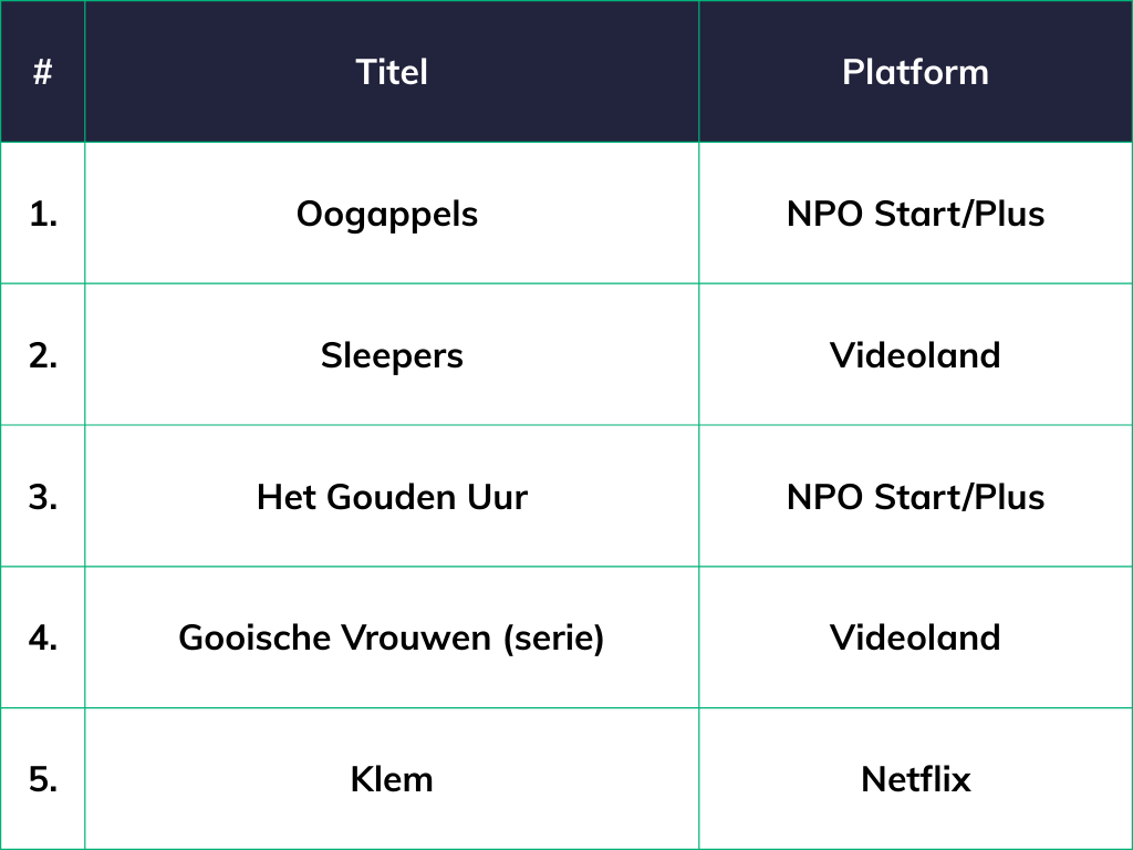 De NPO scoorde in 2025 goed met Nederlands drama, mede dankzij nieuwe seizoenen van het populaire Oogappels en de spannende serie Het Gouden Uur, die voorafgaand aan de lineaire uitzending al op NPO Start te zien was. Videoland moest het dit jaar doen zonder kijkcijferkanon Mocro Maffia, maar deed het goed met Sleepers en de Talpa-serie Gooische Vrouwen. De serie Klem is oorspronkelijk een NPO-titel, maar dankt zijn positie in deze toplijst aan de hernieuwde belangstelling door het verschijnen op Netflix.
