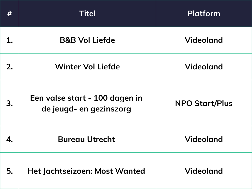 Reality en meer specifiek love-reality is een genre dat blijft scoren. Ook dit jaar maakte B&B Vol Liefde en de wintereditie Winter Vol Liefde weer de tongen los op de sociale media en rond het koffieapparaat. Beide titels waren ook lineair te zien, maar op Videoland kon de hele week vooruit worden gekeken. Bij de NPO is het opvallend dat de serieuze documentaireserie Een Valse Start populairder was dan het spelprogramma Wie is de Mol? en het satirische programma Even Tot Hier, beide aanwezig in de Top 10.