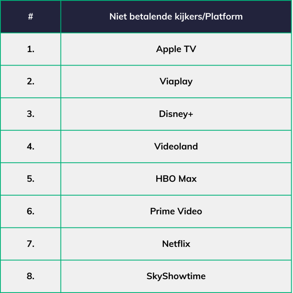 Gemiddeld blijken een op de vijf kijkers niet te betalen voor de streamingdienst(en) die ze bekijken. De spreiding rond dit gemiddelde is opvallend groot. Bij Apple TV, de dienst met het hoogste percentage meelifters, is dit aandeel maar liefst zeven keer groter dan bij SkyShowtime, de dienst waar het minst gratis wordt meegekeken.